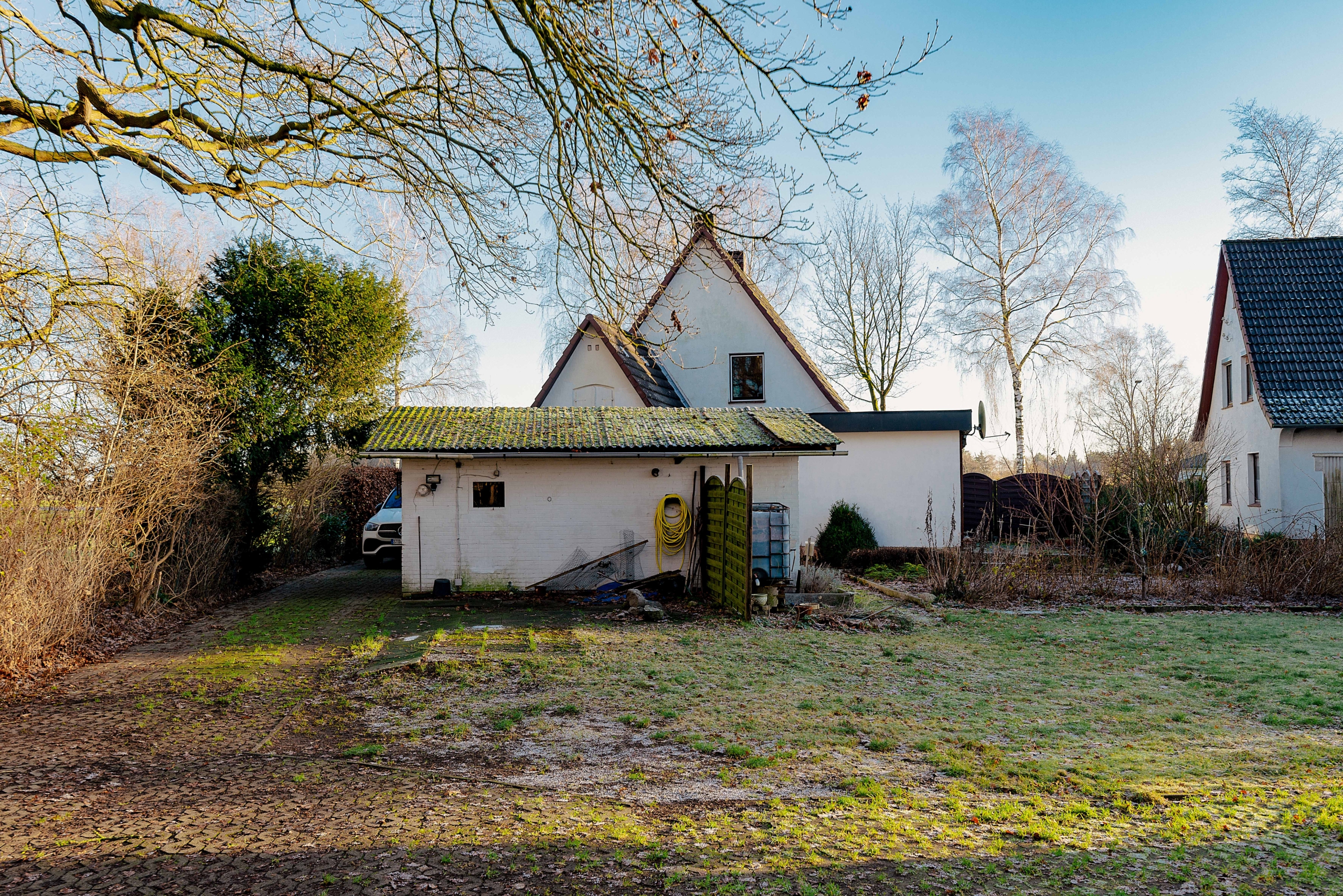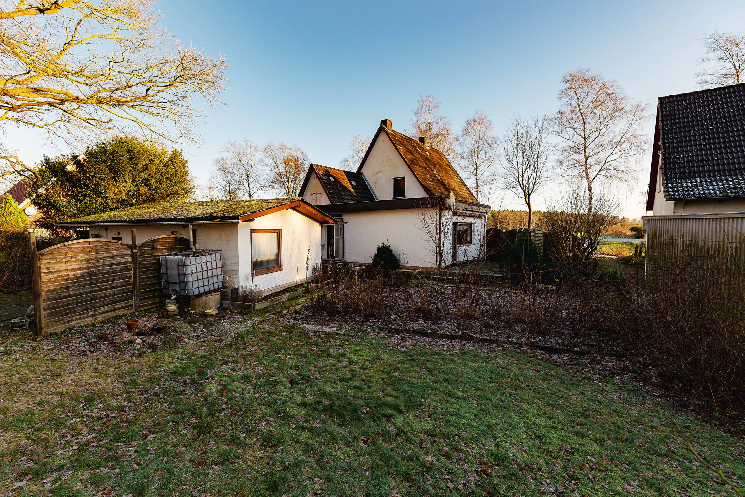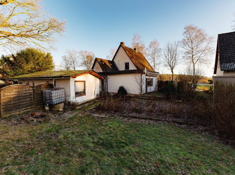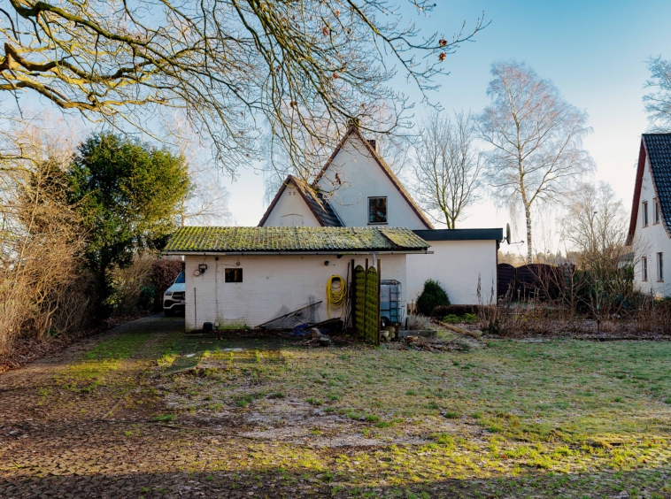 Der Außenbereich des Hauses bietet einen großzügigen Garten, mit einer kleinen Garage, einer