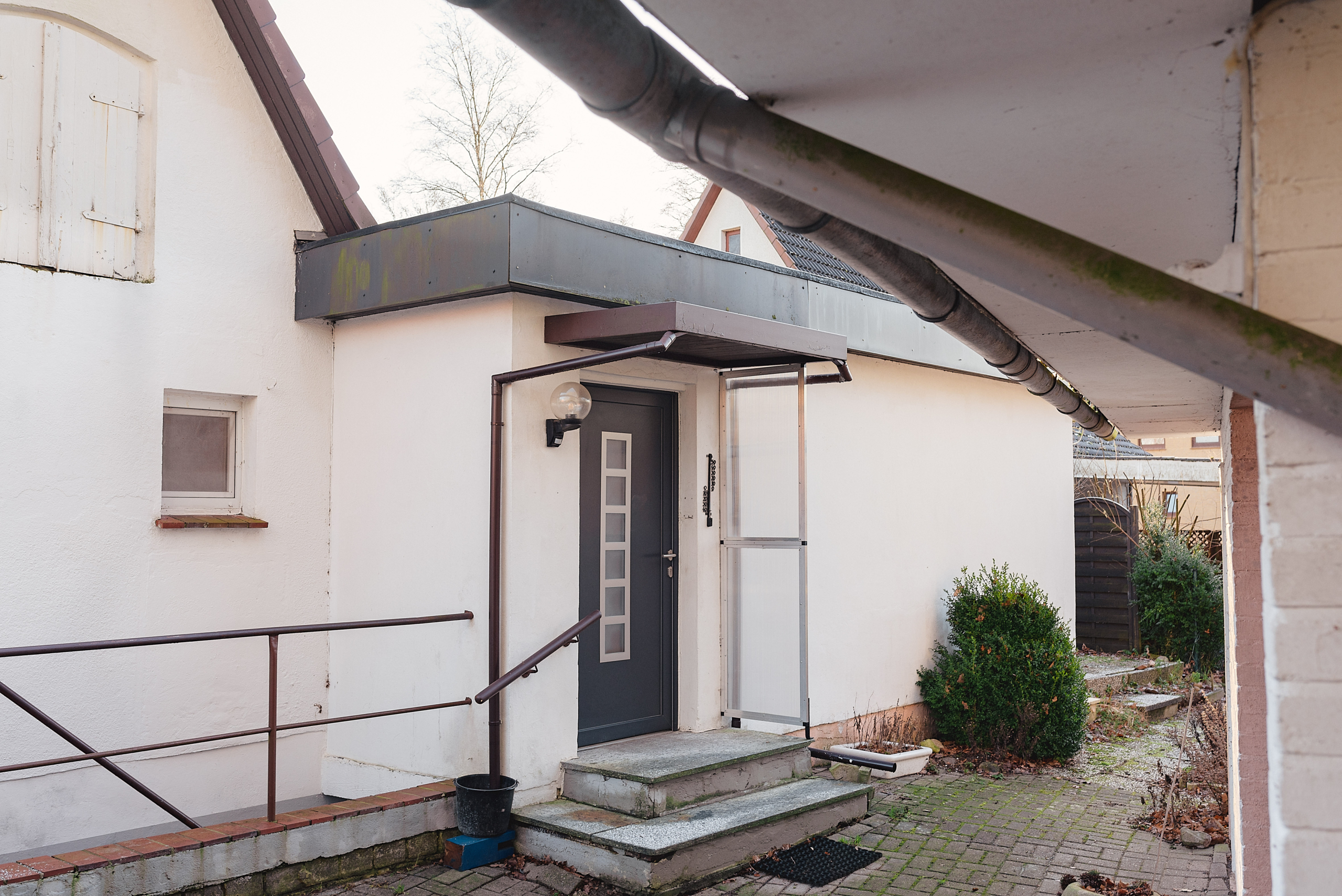 Das 1955 errichtete Haus betreten Sie durch einen kleinen aber feinen Flur. Direkt zu Ihrer linken Seite befindet sich das erste Zimmer. Durch die ruhige Lage, kann es durchaus als Schlafzimmer genutzt werden. Aber auch als Büro oder Gästezimmer ist es ideal geschnitten. Den Flur weiter entlang, können Sie in das Wohnzimmer und Esszimmer gehen. Ein möglicher Durchbruch würde Ihnen einen wirklich sehr großen Wohnbereich schaffen. Zu Ihrer rechten Seite befindet sich die Treppe nach unten in den Keller und der Zugang zur gepflegten Küche. Die Küche bietet genügend Raum für eine kleine Sitzgelegenheit und ein gemeinsames Frühstück oder Abendessen. Aus dem Esszimmer heraus gehen Sie in den hinteren Teil des Hauses, in welchem sich eine weitere Küche sowie ein saniertes Duschbad befindet. Der große Wohnbereich mit
