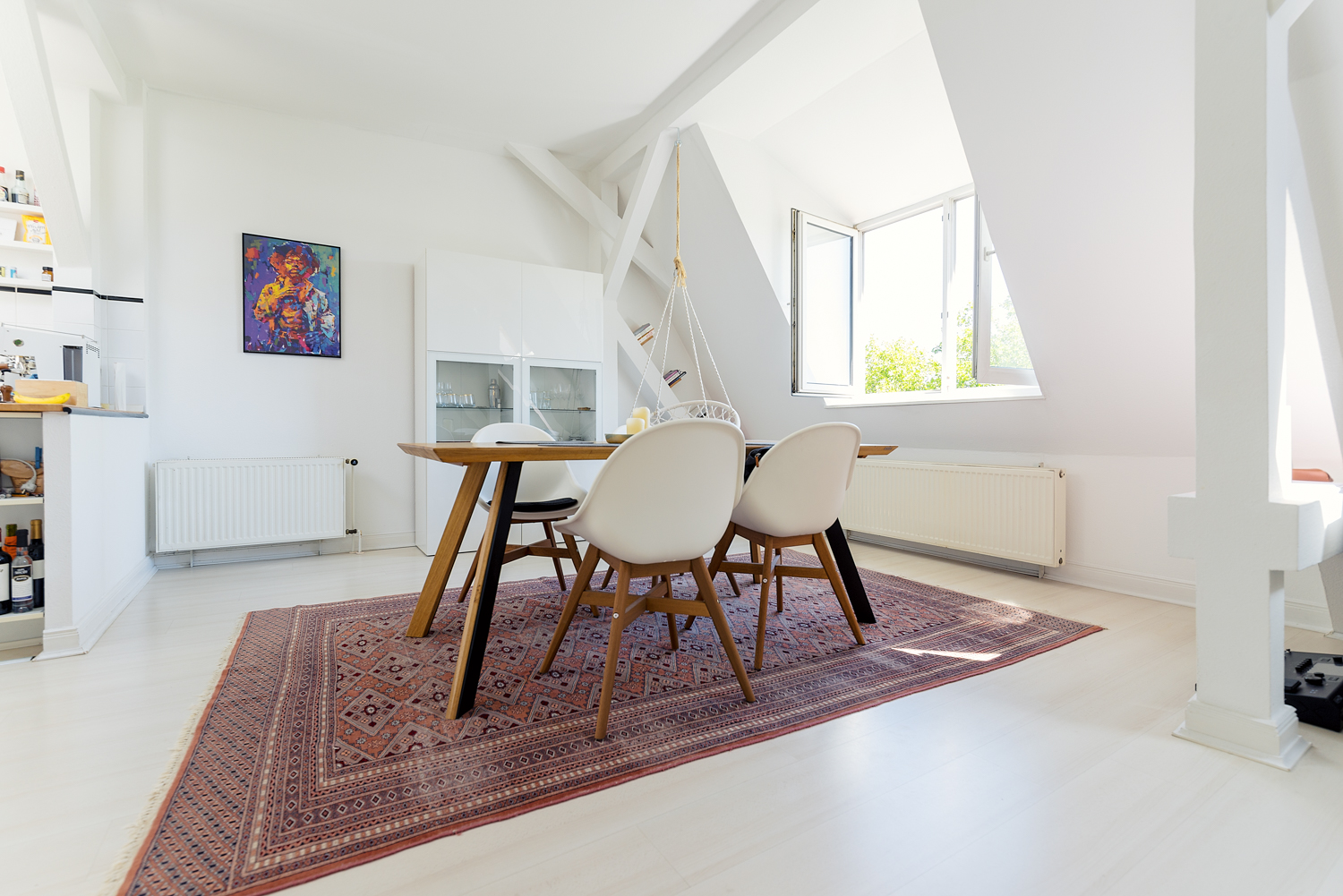 Durch die Betondecke kriegen Sie, trotz Altbau, kaum etwas von Ihren Nachbarn mit. Nach Feierabend einfach entspannt die Füße hochlegen und vom Rest der Welt abschalten ist hier, trotz sehr zentraler und belebter Lage, möglich! Das gut geschnittene Loft verfügt über einen einladenden Wohn- und Essbereich. Besonders schön: Die Holzbalken, die dieses Loft gemütlich und außergewöhnlich machen. Finden Sie nicht auch? Die Küche ist minimal gehalten und eingerichtet.