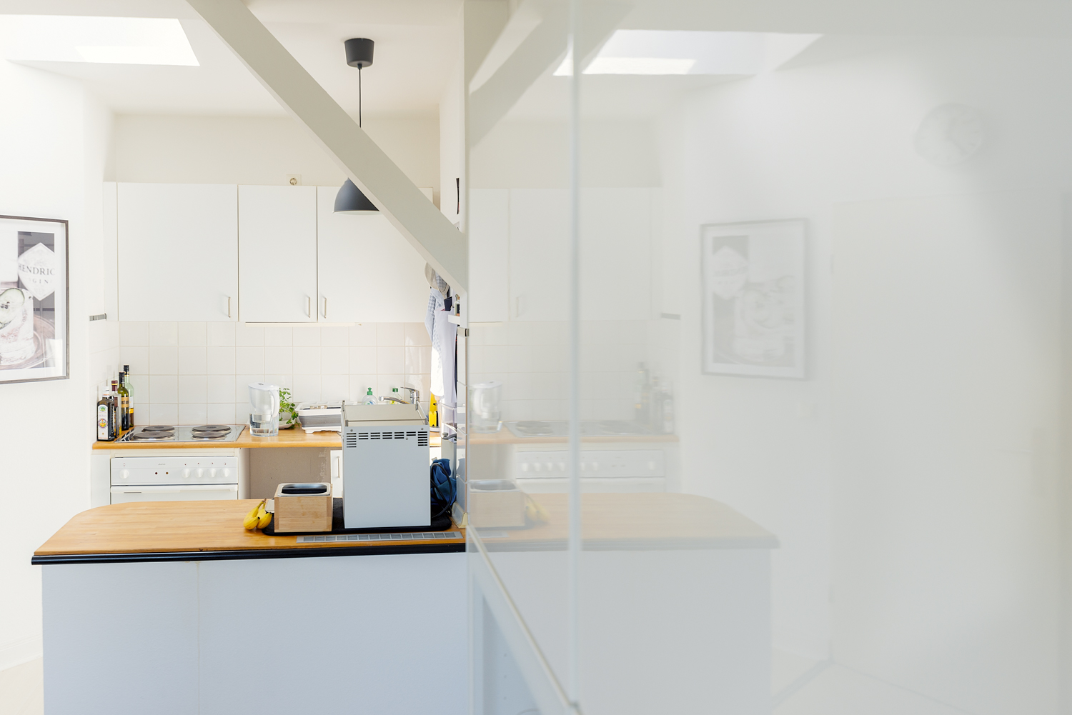Kochen, Arbeiten, Lesen, Feiern, Entspannen! Der Wohn-Essbereich ist mit einer offenen Kochnische ausgestattet. Die großen Velux-Fenstern durchfluten die Wohnung mit Licht. Auch an ein Oberlicht in der Küche wurde gedacht. Toll!