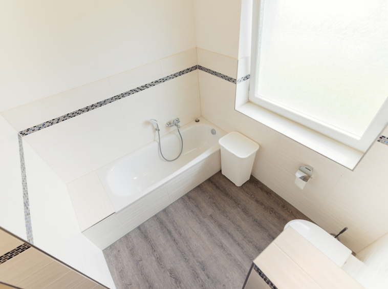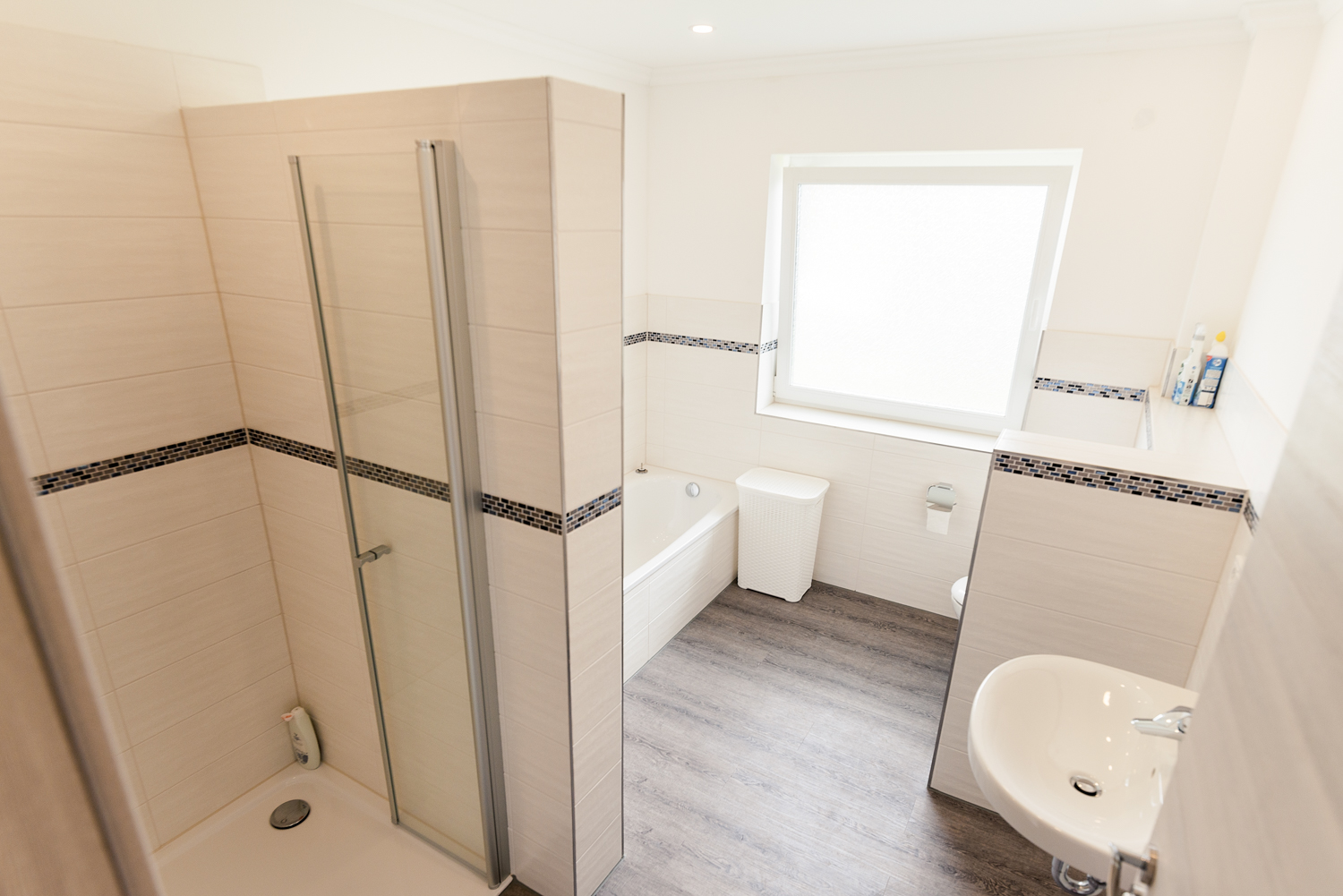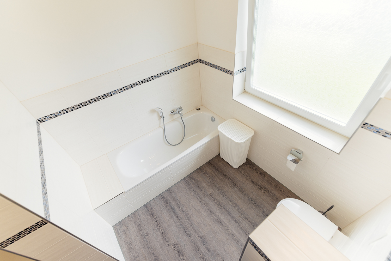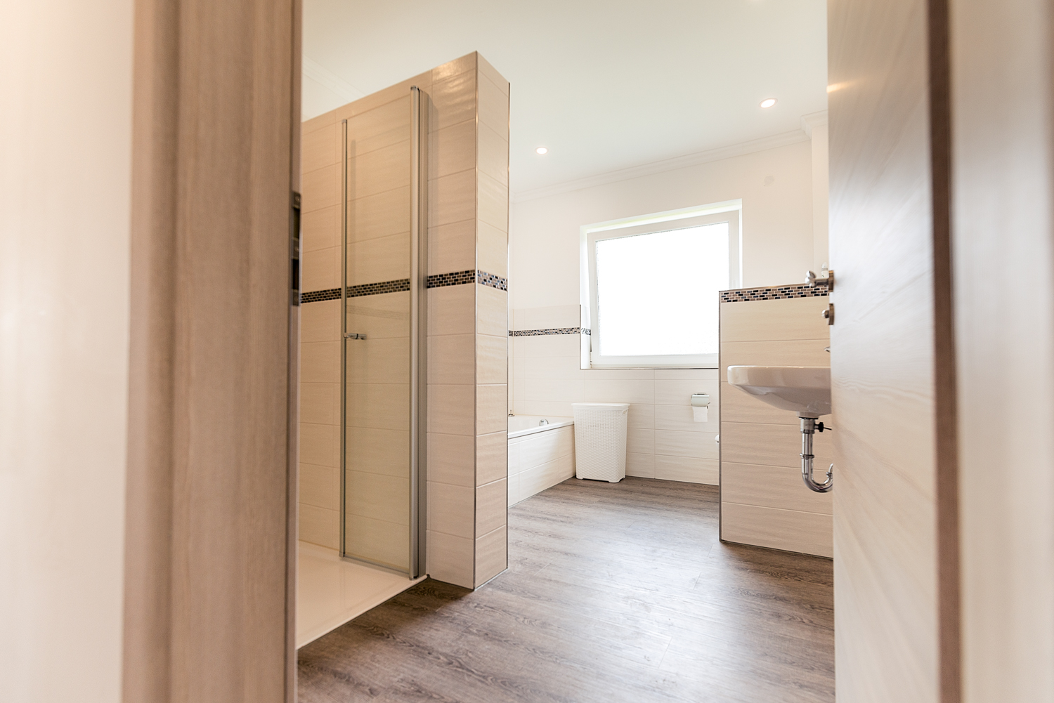 Das Gäste WC sowie das Bad sind mit schönen, zeitlosen Fliesen verlegt. Kleine Fliesen Bordüren machen es zu einem modernen Bad. Die bodentiefe Dusche ist schick, ein Highlight ist die Badewanne.