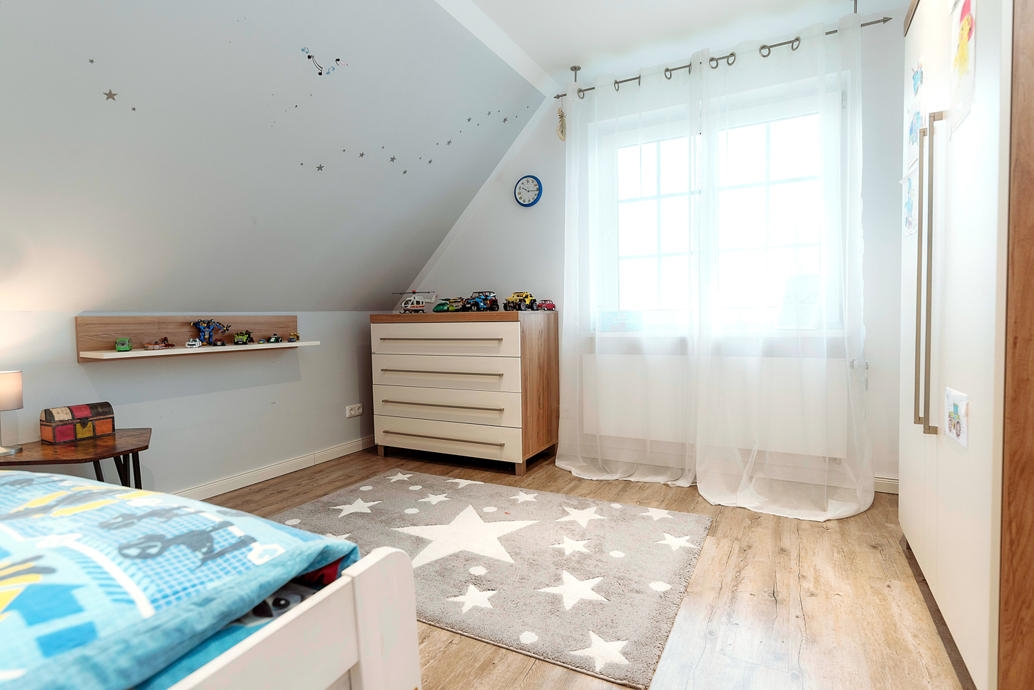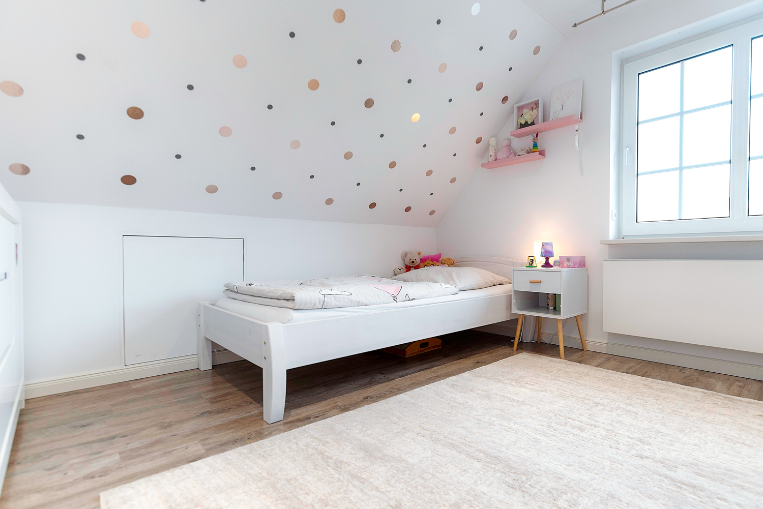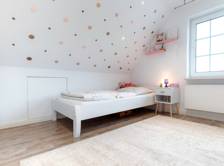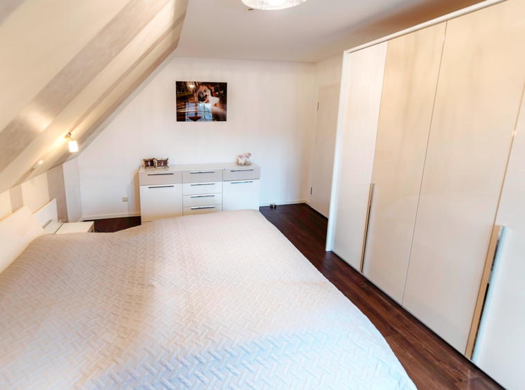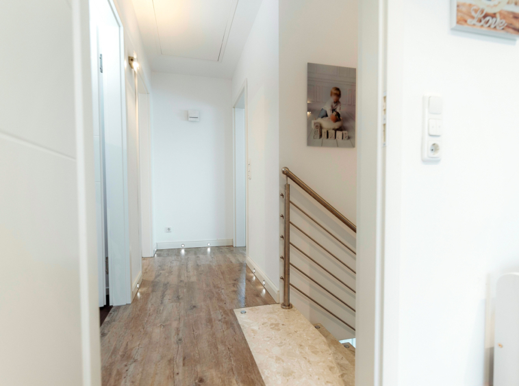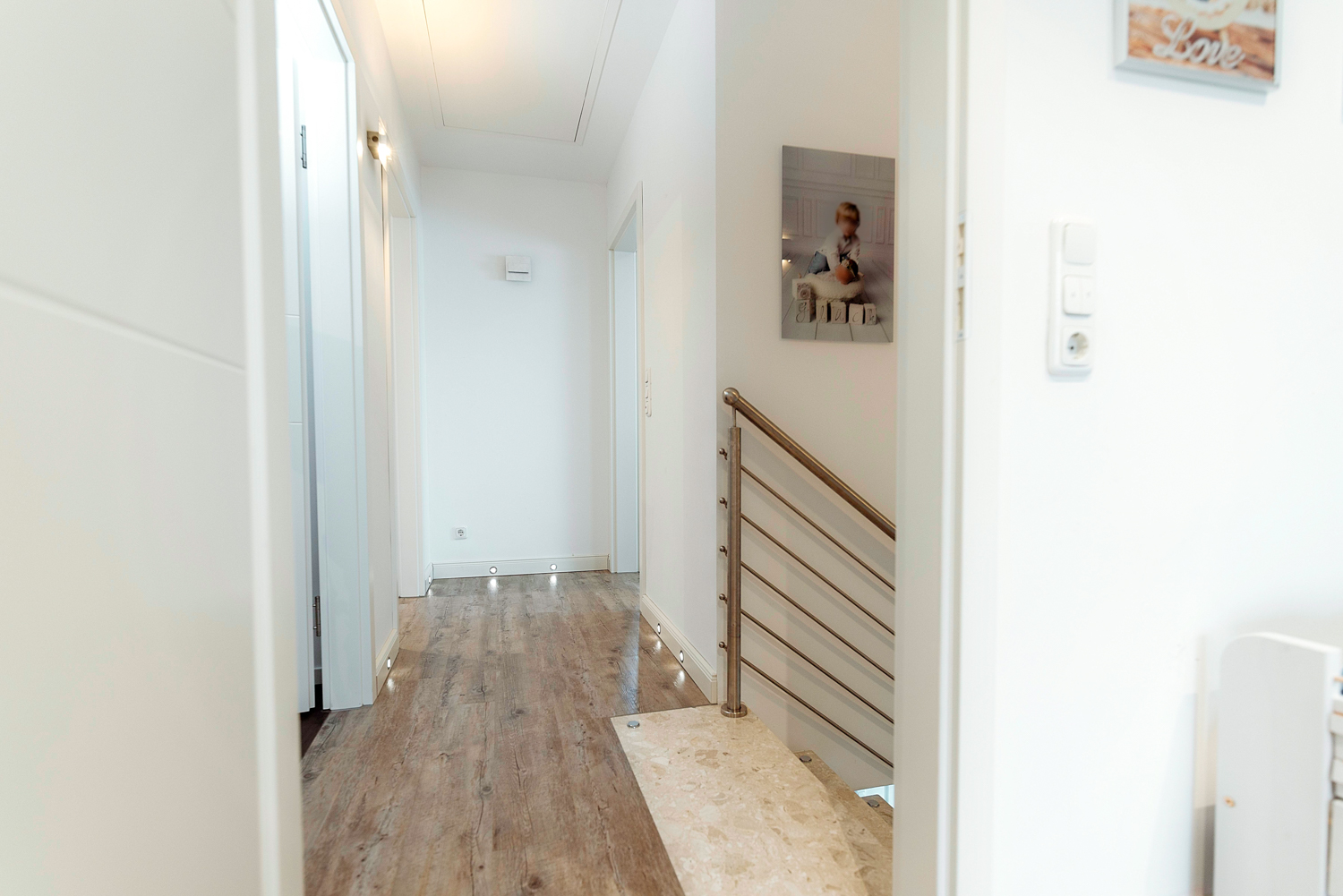 Die hellen Zimmer sind schön geräumig. Die Nutzungsmöglichkeiten der zahlreichen Zimmer reichen von Kinderzimmer bis hin zum Home-Office oder Gästezimmer. Oben befinden sich 3 weitere separate Schlafzimmer, die alle von der Ruhe draußen profitieren – mit offenen Fenstern schlafen