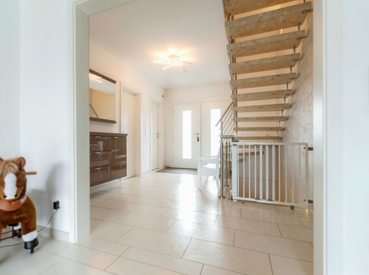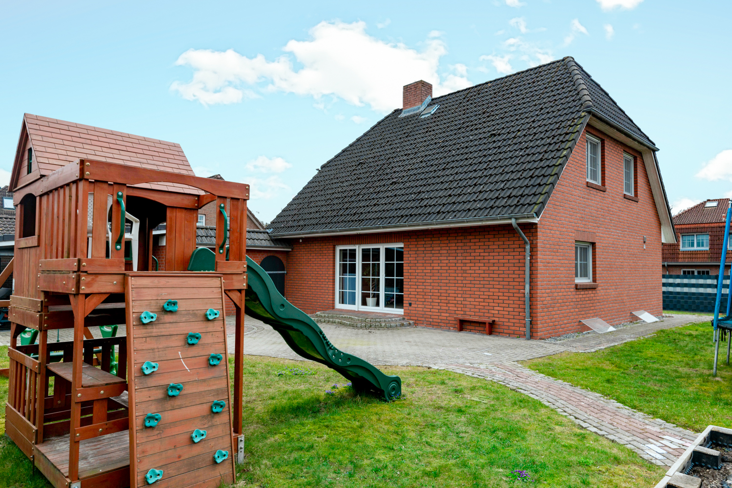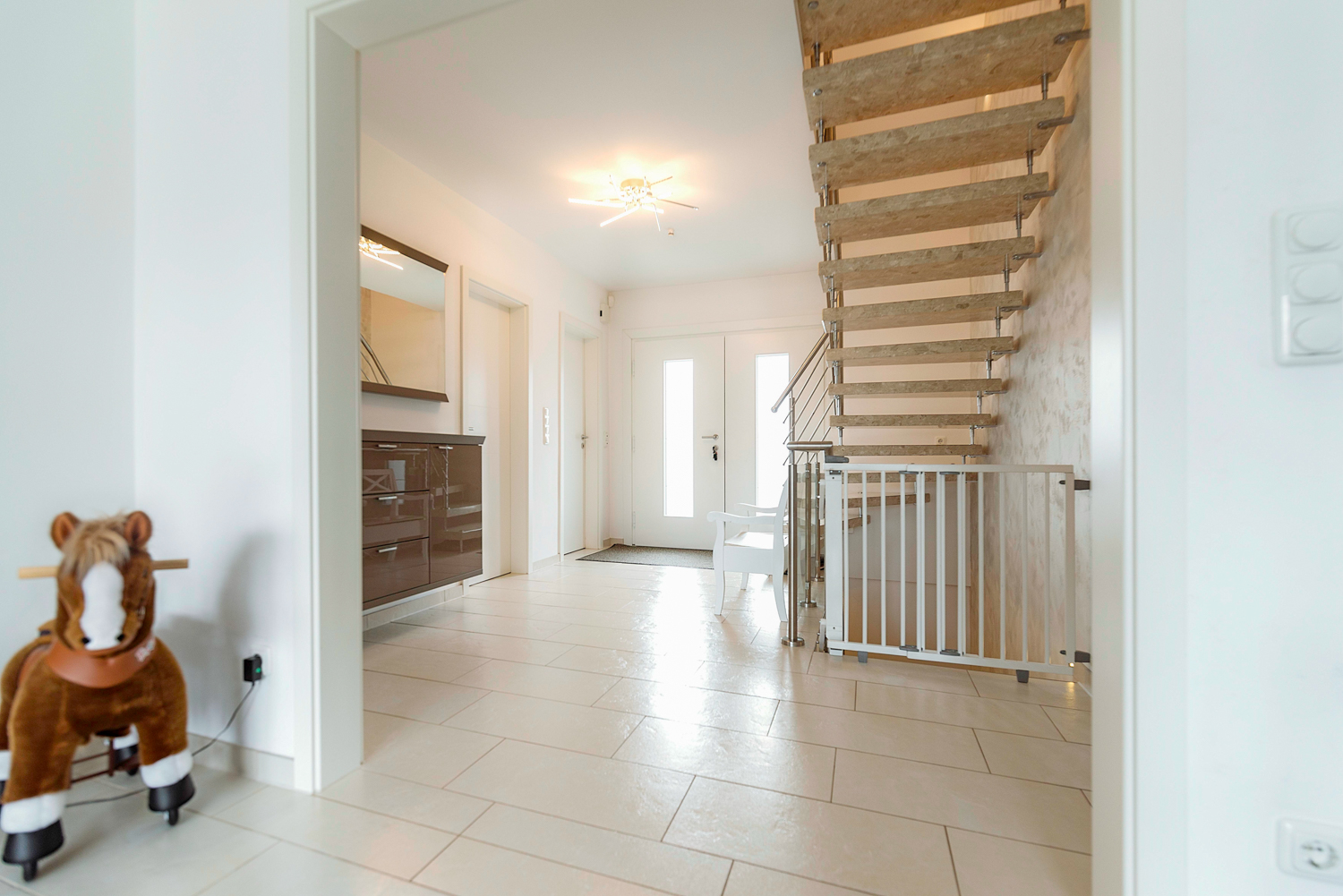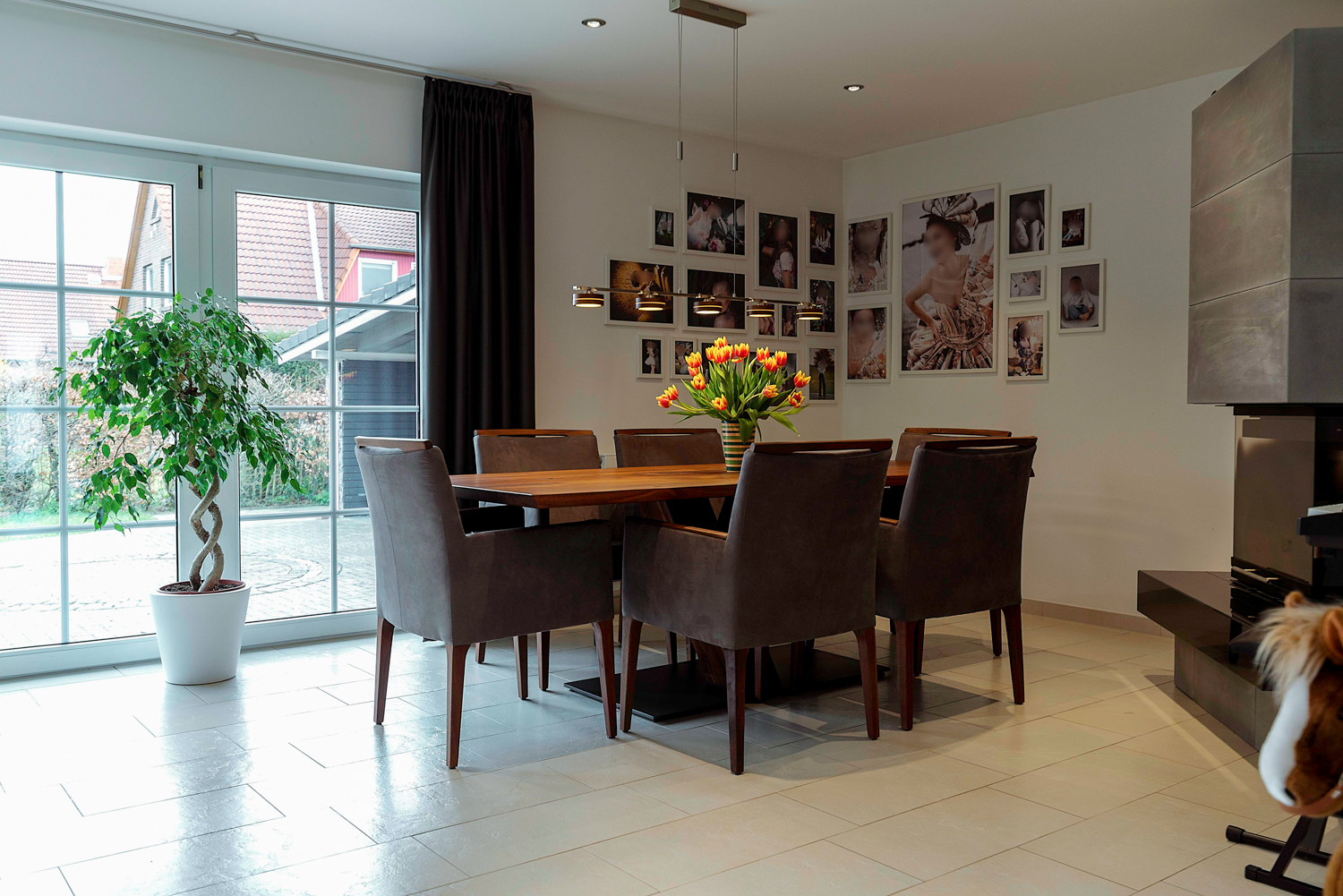 Das 1995 errichtete Haus betreten Sie durch einen lichtdurchfluteten, einladenden und geräumigen Flur. Direkt zu Ihrer rechten Seite befindet sich eine Garderobe und ein großzügig geschnittenes und ebenfalls modernes Gäste-WC. Zwischen 2014 und 2020 wurde das Haus saniert und erstrahl von innen im neuen Glanz. Gespart wurde beim Umbau nicht. Den Flur weiter entlang, können Sie in das Wohn- und Esszimmer gehen, mit direktem Blick in den großen Garten und auf die Terrasse. Der Kamin und der Blick ins Grüne sind wirkliche Highlights. Zu Ihrer linken Seite befindet sich die Treppe nach unten in den großzügigen Keller und der Zugang zur neuen Küche. Die Küche bietet genügend Raum für Sitzgelegenheiten und ein gemeinsames Frühstück oder Abendessen kann hier in schöner Atmosphäre genossen werden. Mit einer Granit Arbeitsplatte, Miele und Neff Elektrogeräten und einem schicken und modernen Design, lässt diese Küche die Herzen von Kochfans höher schlagen. Aus dem Essbereich heraus gehen Sie auf die Terrasse und in den Garten. Hier haben Sie auch zahlreiche Abstellflächen, ein großzügiges Carport sowie viel Platz zum Spielen, Toben, Genießen und Spaß haben. Der Sommer kann kommen! Der große Wohnbereich mit Terrassenzugang macht diesen Abschnitt des