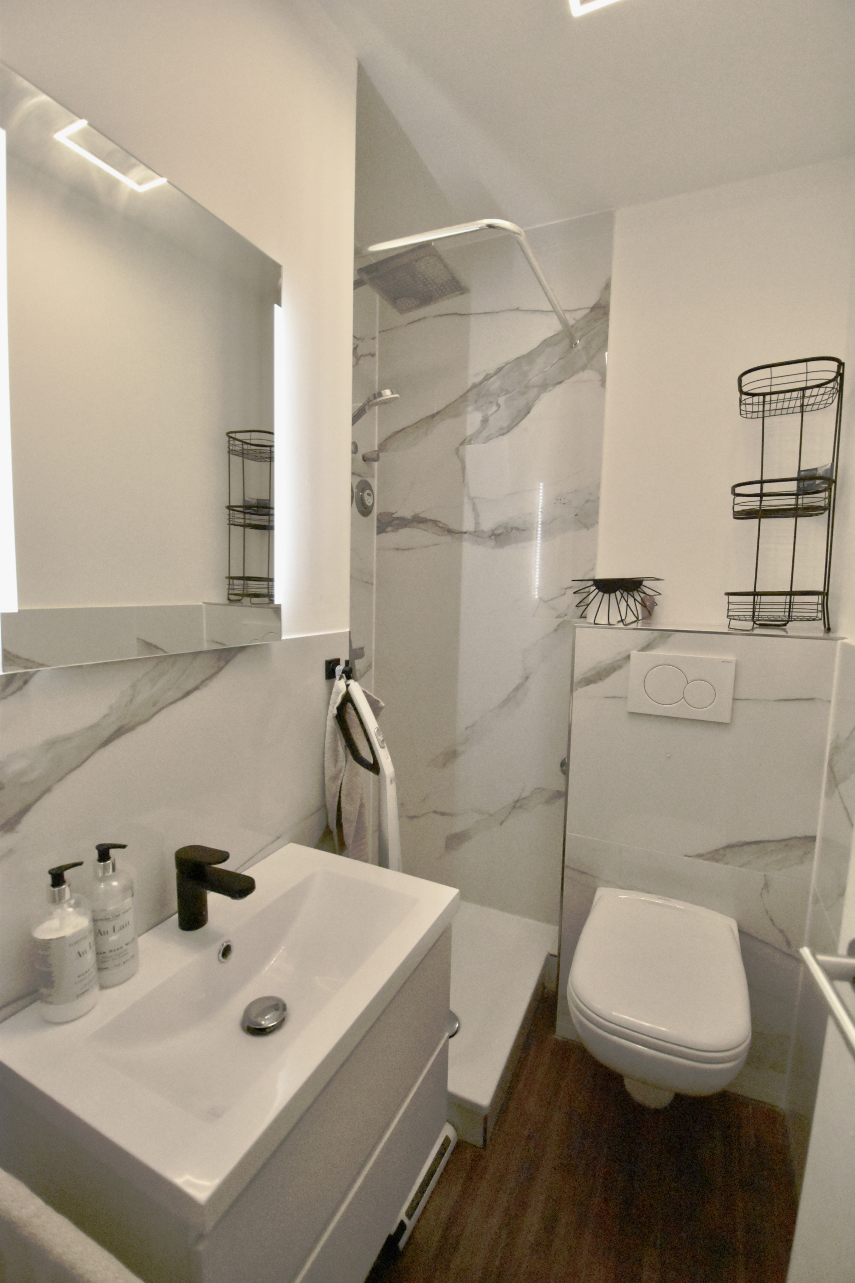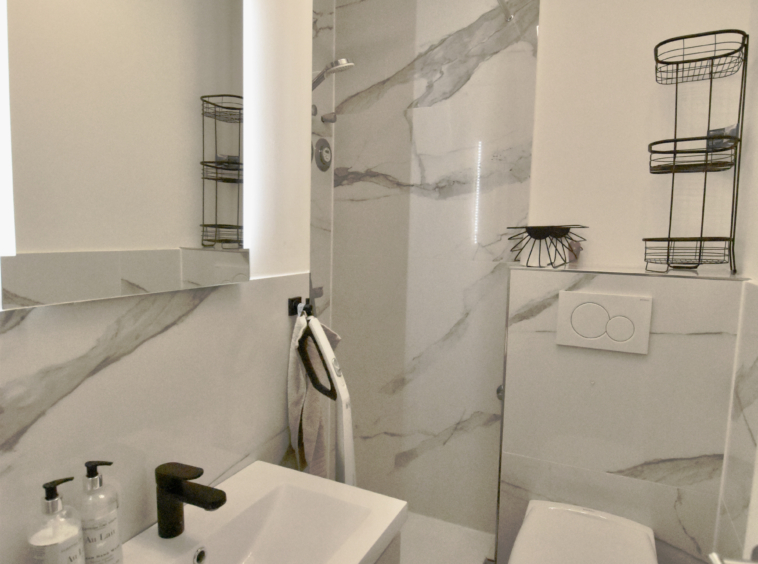 Was einem beim Betreten der Wohnung direkt auffällt, ist das sanierte Duschbad in schöner Marmor-Optik. Das Bad verfügt über eine Eckdusche, ein großzügiges Waschbecken mit Unterbauschränken sowie einem großen beleuchteten Spiegel.
